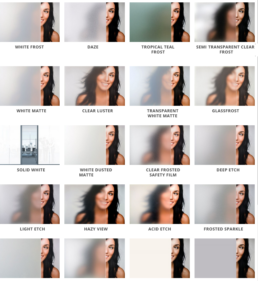 • Residential Use: Add style and privacy to bathrooms, bedrooms, and glass cabinets while still allowing light to filter through.